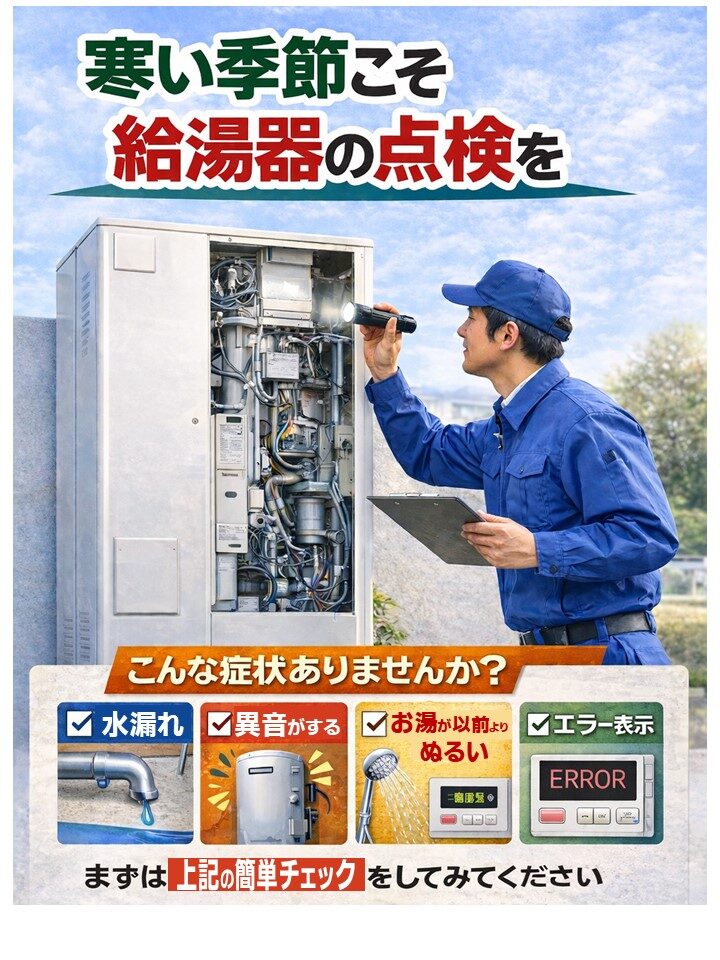 2026年2月1日 / 最終更新日 : 2026年2月1日 こばやし お知らせ 給湯器の点検してますか? 寒い季節、給湯器不具合のお問い合わせが増えています。エコキュートや電気温水器、石油ボイラーなどは家の裏手など、普段は立ち寄らない場所に設置されるいることも多く、不調あっても気付きにくい。この機会に水漏れが確認しやすい、晴れた日に点検をしてみてはいかがでしょうか? 簡単なチェックをして頂き、お気づきの点がありましたらお気軽に問い合わせ下さい FacebookXBluesky