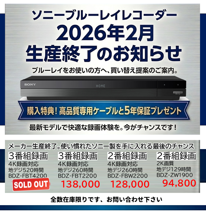 2026年4月1日 / 最終更新日 : 2026年3月31日 こばやし 家電製品 ソニーブルーレイレコーダー若干入荷 ソニーブルーレイレコーダーが2月に生産終了。若干数在庫ございます 貴重なソニー製は当店在庫の台数限りです。お電話にてお問い合わせ下さい。 FacebookXBluesky