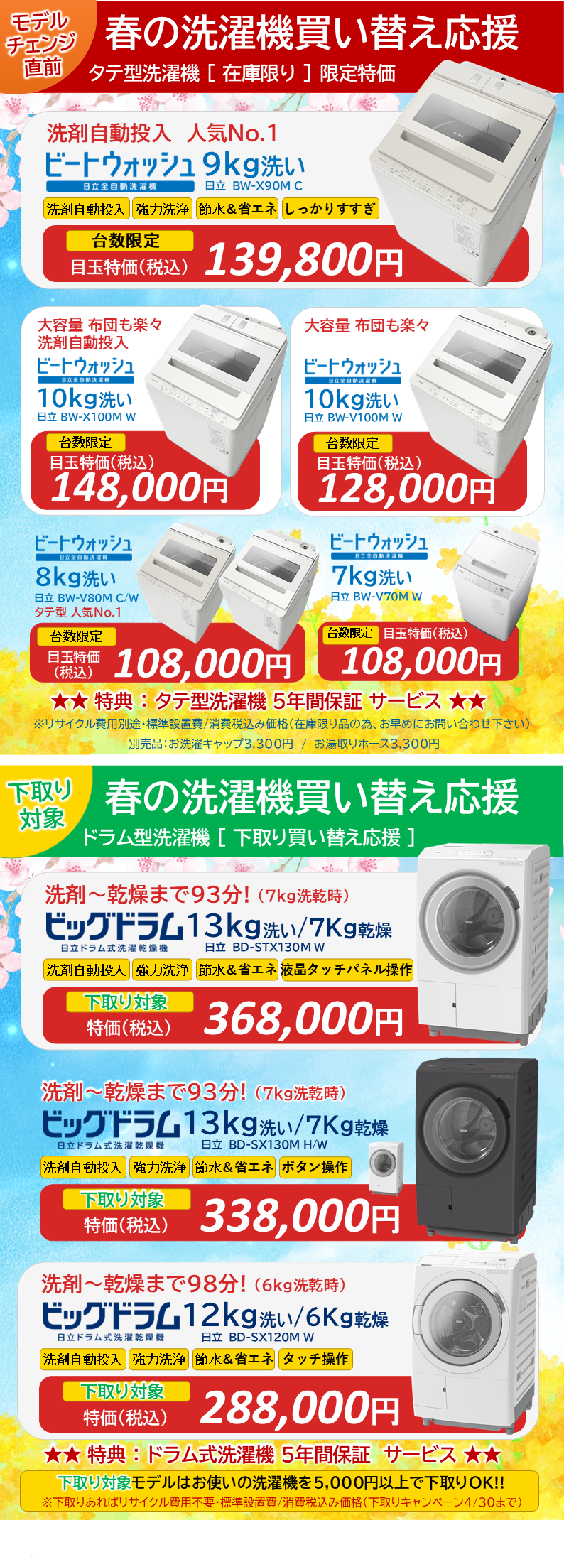 2026年4月1日 / 最終更新日 : 2026年3月31日 こばやし お知らせ 春の洗濯機買い替えキャンペーン 毎日お使いの洗濯機、何年位お使いでしょうか? 8年以上経過でしたらそろそろ買い替えのご検討をオススメします。 タテ型洗濯機は5~6月頃新商品発売!? 現行機種をオトクにご奉仕。ドラム洗濯機に買い替えで下取りok!